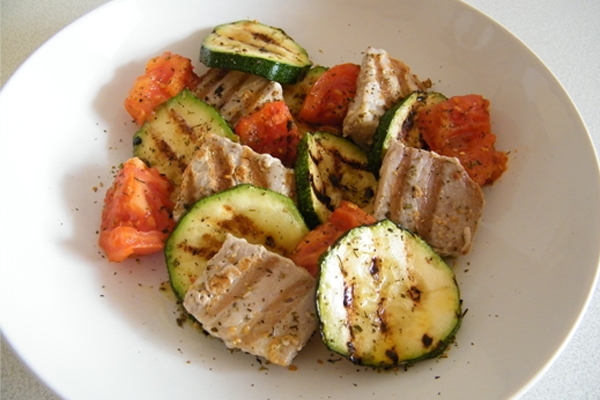 Cuando tengamos todos los tacos de atún marcados, con otra plancha o una vez limpiada la misma realizamos los mismos pasos. Calentamos con un chorrito de aceite y una pizca de sal la plancha, cuando esté bien caliente añadimos las rodajas de calabacín, y por último los trozos de tomate.